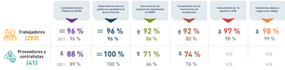 Además de los PRNU, se observan los Principios Voluntarios de Seguridad y DDHH, el Pacto Global de la ONU, los Principios ONU de conducta para las empresas de lucha contra la discriminación de las personas LGBTIQ+, y la Declaración de la OIT relativa a los principios y derechos fundamentales en el trabajo. El modelo se trabaja de forma sinérgica con diversas áreas internas corporativas y operativas, cuenta con indicadores de gestión y resultados y es reportado constantemente a la Alta Dirección y Junta Directiva, asegurando así su gobernanza. |