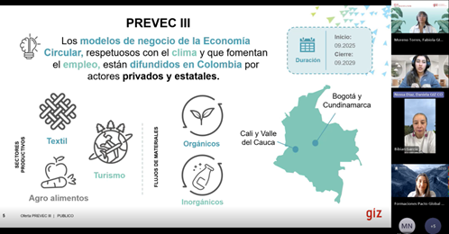 Durante el espacio se presentó el programa de Economía Circular Prevec III de la Agencia de Cooperación Alemana (GIZ), enfocado en fortalecer y escalar modelos de negocio circulares en Colombia, promoviendo el ecodiseño, la reutilización, la remanufactura, el reciclaje y la valorización de residuos, así como la generación de empleo verde.