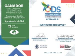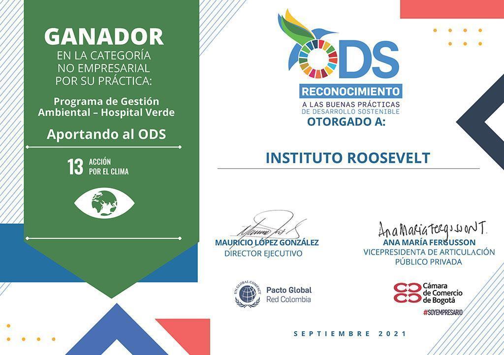 El Instituto Roosevelt es un hospital líder en pediatría especializada, ortopedia y rehabilitación infantil. En él se promueve el desarrollo de la sustentabilidad y la salud ambiental trabajando de manera alineada con los Objetivos de Desarrollo Sostenible y aportando al cumplimiento de la agenda 2030. Por lo cual, el Programa de Gestión Ambiental y Hospital Verde fundamenta sus esfuerzos en acciones por el cambio climático desde el compromiso con la huella de carbono institucional, conservación de los recursos naturales forestales que son parte del Instituto, compras y movilidad más sostenibles, junto a una mejora continua de la gestión ambiental. Además, se consolida para ofrecer al Instituto y fortalecer los enfoques que actualmente hacen parte del direccionamiento estratégico (Sostenibilidad, Reducción del consumo de recursos naturales, energía y agua, Más reciclaje y menos residuos hospitalarios, Alimentación ecológica y Liderazgo para la sostenibilidad) trabajando para tener un alcance de sostenibilidad a todos los grupos de interés. | |||
