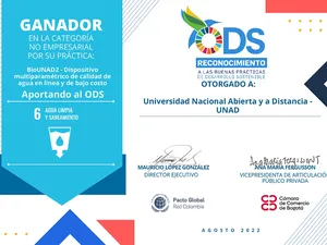 Iniciativa implementada: | BioUNAD2- Dispositivo multiparamétrico de calidad de agua en línea y de bajo costo, es un producto de investigación, desarrollo e innovación que mide temperatura, el pH, conductividad eléctrica, turbidez, potencial de óxido reducción y oxígeno disuelto, parámetros que en su conjunto permiten conocer el estado de potabilización del agua en acueductos comunitarios, y de esta manera coadyuvar a la toma de decisiones en tiempo real. Se presenta el prototipo en las siguientes imágenes.