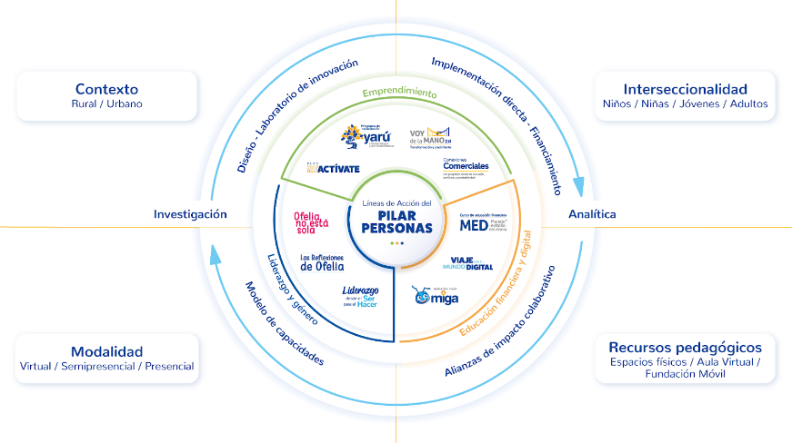 2.9. Sostenibilidad en el tiempo: | Actualmente, la estrategia de “Ofelia no está sola” hace parte del pilar de Programas de la Fundación WWB Colombia. El pilar de Programas tiene el objetivo de fortalecer las capacidades personales y empresariales de nuestra población beneficiaria a través de nuestros procesos formativos. La estrategia de “Ofelia no está sola” está asociada a nuestra línea de Liderazgo y Género como una línea temática fundamental para alcanzar el propósito final de la Fundación WWB Colombia: el cierre de brechas de desigualdad desde una perspectiva de género. Iniciativas del Pilar Personas