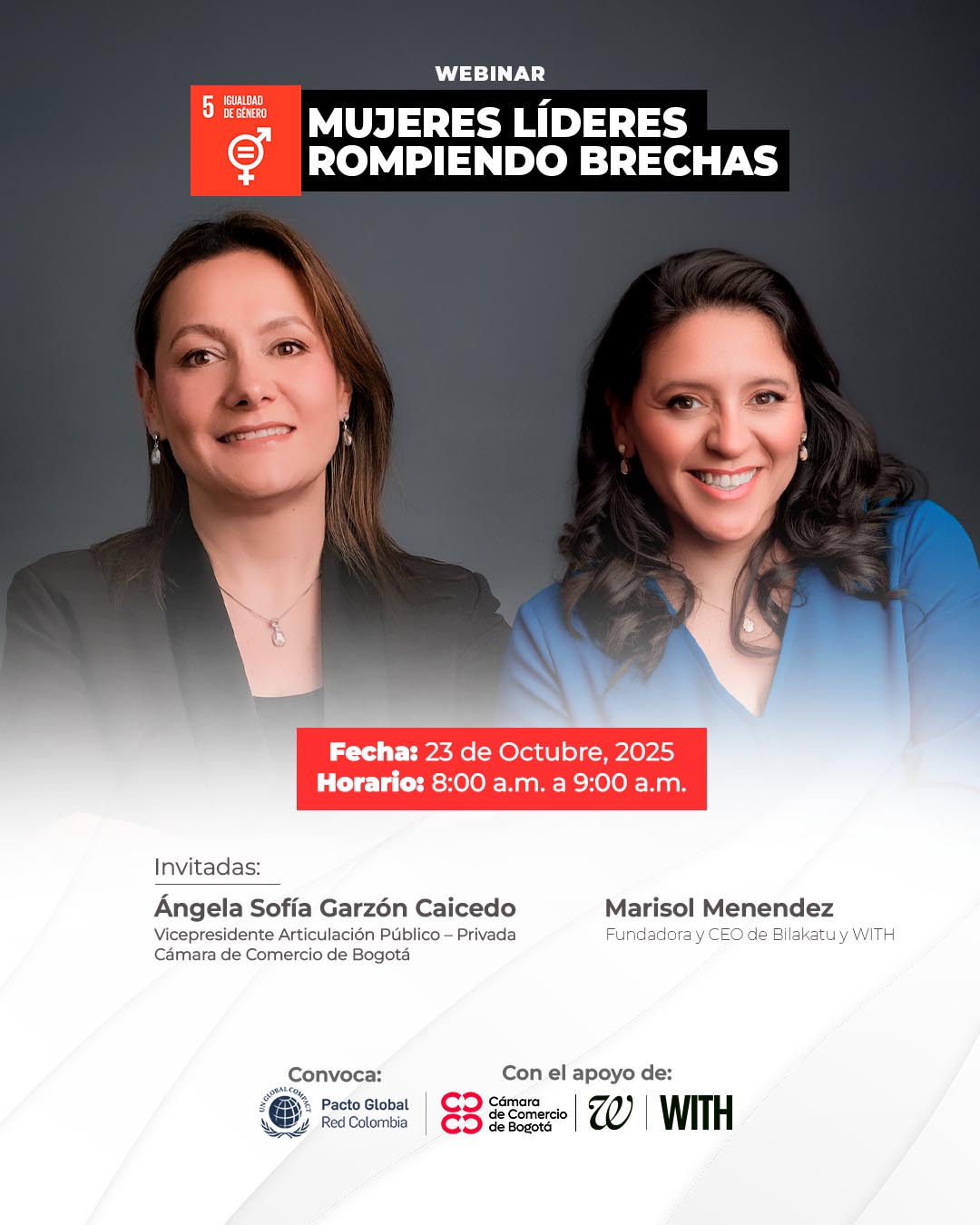Te invitamos a participar en el webinar “Mujeres Líderes Rompiendo Barreras”, un espacio que reunirá a dos voces inspiradoras: Ángela Sofía Garzón Caicedo, Vicepresidente de Articulación Público – Privada de la Cámara de Comercio de Bogotá, y Marisol Menéndez, Fundadora y CEO de Bilakatu y WITH. Este diálogo es convocado por Pacto Global Red Colombia, con el apoyo de la Cámara de Comercio de Bogotá y la Red WITH, y busca resaltar cómo el liderazgo femenino sigue transformando realidades y abriendo caminos para más mujeres en todos los sectores.