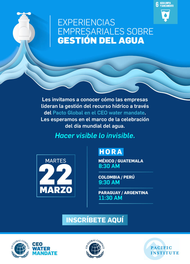 Experiencias Empresariales sobre la Gestión del Agua | | En el marco del Día Mundial del Agua los invitamos a conocer cómo las empresas lideran la gestión del recurso hídrico a través de Pacto Global en el CEO Water Mandate. Reconociendo el papel que el agua y el saneamiento juegan en las operaciones de las empresas, así como el papel positivo que las empresas mismas pueden desempeñar, el CEO Water Mandate fue creado para movilizar la gestión y la supervisión del agua a nivel global e involucra diferentes actores interesados tales como empresas, sociedad civil, ONU, Gobiernos y otros. Inscripciones AQUÍ
