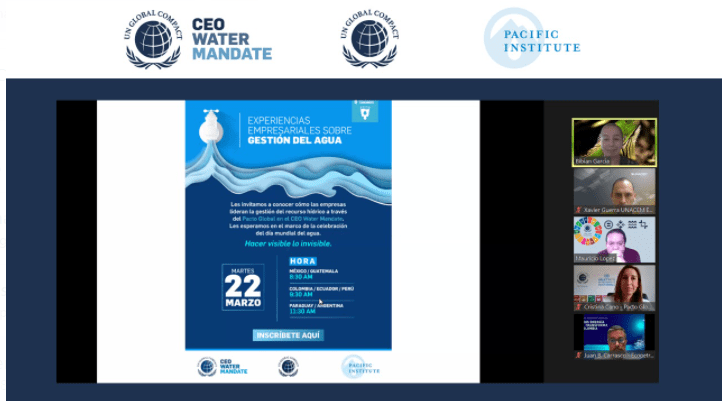 Acciones empresariales a favor de la correcta gestión del agua | | El pasado 22 de marzo se llevó a cabo el Webinar: Experiencias Empresariales sobre Gestión del Agua, una actividad que hizo parte de la conmemoración del Día Mundial del Agua y que buscaba hacer visible esas “acciones invisibles” que tienen las organizaciones en la gestión del recurso hídrico, además de motivar a otras empresas a trabajar a favor de la conservación de este recurso vital. La sesión contó con cerca de 210 asistente en línea de países como Colombia, Ecuador, Guatemala, México y Paraguay. Conozca todos los detalles aquí. |