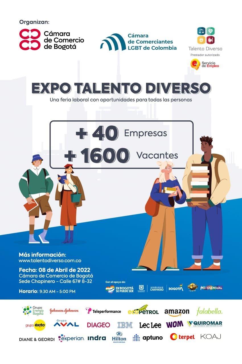 Expo Talento Diverso Una Feria Laboral con oportunidades para todas las empresas | | Les esperamos en la Sede de Chapinero de la Cámara de Comercio de Bogotá, el próximo 8 de abril de 9:30 AM a 5:00 PM. Mayores informes en este enlace. |