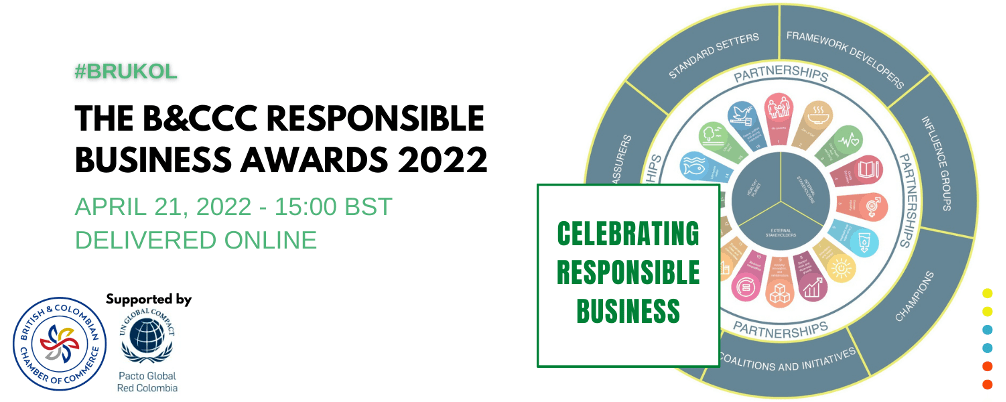 B&CCC Responsible Business Awards 2022 #BRUKOL | | Pacto Global Red Colombia lo invita a participar en la ceremonia de los “Responsible Business Awards 2022” #Brukol, que se llevarán a cabo el próximo 21 de abril en línea, organizados por la Cámara de Comercio Británico Colombiana en Londres (B&CCC). La ceremonia contará con un panel de discusión entre empresas y actores estratégicos quienes compartirán su camino a convertirse en una empresa responsable, resaltando buenas prácticas, retos y aciertos. Para registrarse por favor haga clic en este enlace. |