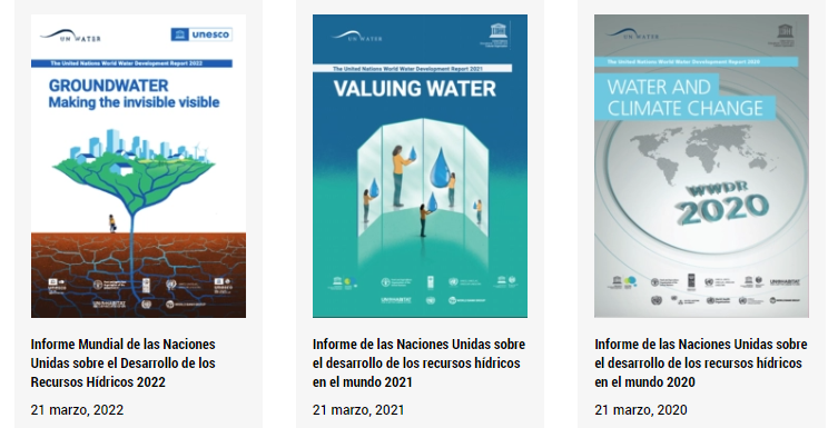 Informe sobre el desarrollo de los recursos hídricos en el mundo de las Naciones Unidas | | “El Informe sobre el desarrollo de los recursos hídricos en el mundo (WWDR) de las Naciones Unidas es el informe principal de ONU-Agua sobre cuestiones relacionadas con el agua y el saneamiento. Lanzado en el Día Mundial del Agua, el informe se centra en un tema diferente cada año y brinda recomendaciones de políticas a los tomadores de decisiones al ofrecer mejores prácticas y análisis en profundidad. El WWDR es publicado por la UNESCO en nombre de ONU-Agua y su producción está coordinada por el Programa Mundial de Evaluación de los Recursos Hídricos de la UNESCO” UN Water. Espere la versión 2023 de este informe, próximamente aquí. |