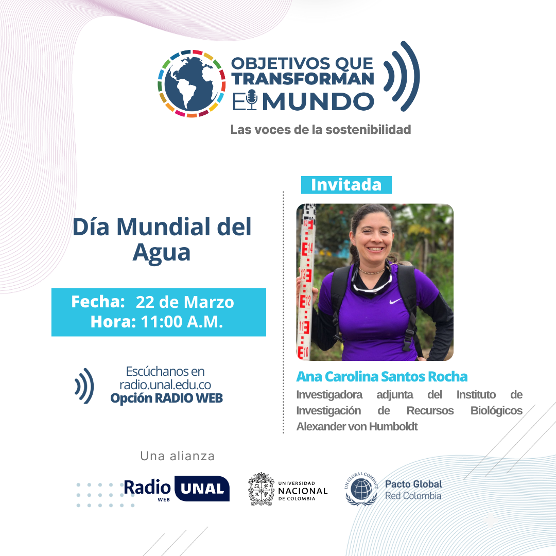 Conmemoremos el Día Mundial del Agua en Objetivos que Transforman el Mundo | | Este miércoles 22 de marzo conmemoraremos el Día Mundial del Agua en Objetivos que Transforman el Mundo, el programa de radio digital de Pacto Global Red Colombia junto a la Universidad Nacional de Colombia. Dialogaremos sobre la importancia del cuidado y del buen uso de los recursos hídricos, desde el sector empresarial y desde la ciudadanía, junto a Ana Carolina Santos Rocha, Investigadora Adjunta del Instituto de Investigación de Recursos Biológicos Alexander von Humboldt; escúchenos en la emisora Radio UNAL web – Opción Radio Web - en vivo a partir de las 11:00 a.m. Recuerde nuestras emisiones anteriores aquí. |