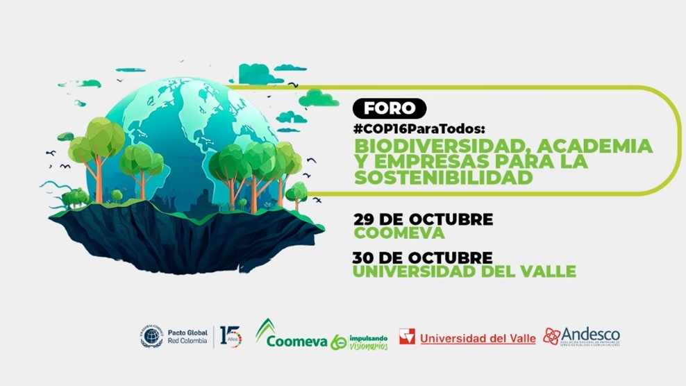 Pacto Global Red Colombia, en alianza con Coomeva , la Universidad del Valle y Andesco , invita cordialmente a empresarios, académicos, organizaciones no gubernamentales y al público en general a participar en el Foro: #COP16ParaTodos: Biodiversidad, Academia y Empresas por la Sostenibilidad. Este evento se desarrollará en el marco de la COP16, que se llevará a cabo en la ciudad de Cali en el mes de octubre. Fecha: 29 y 30 de octubre de 2024 Lugar: Cali, Colombia. Conozca todos los detalles en este enlace. |