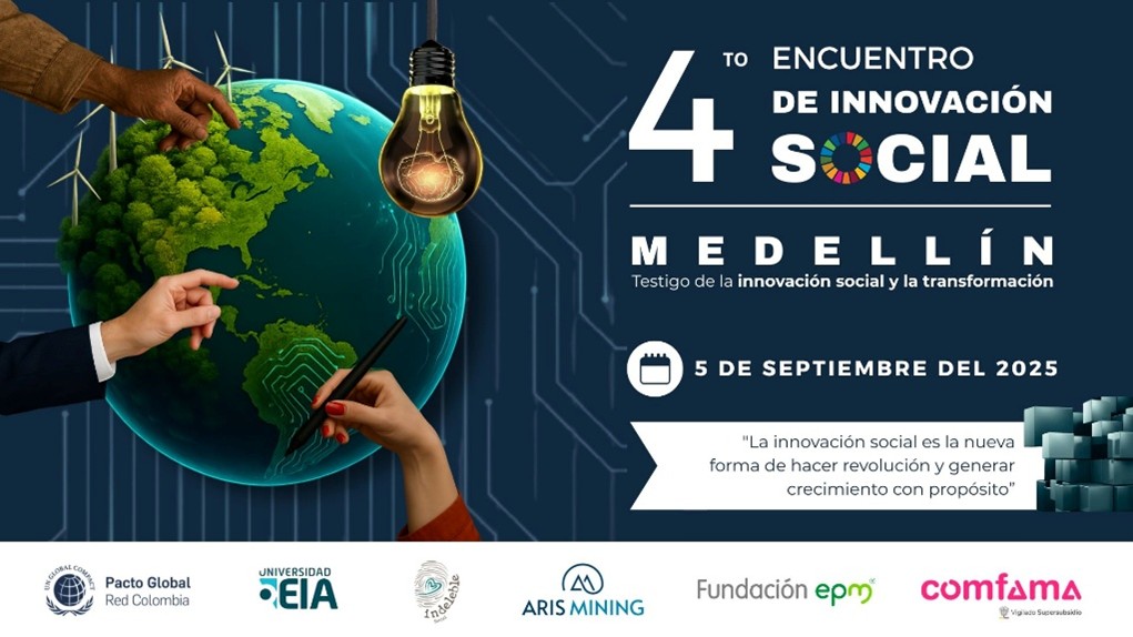 Entrada sin costo. Inscríbase. | | El 4° Encuentro de Innovación Social es convocado por Pacto Global Red Colombia, en alianza con COMFAMA, Universidad EIA, ISA Intercolombia, Fundación EPM, GABRICA, Indeleble Social y Aris Mining, y tendrá lugar el próximo 5 de septiembre en el Centro Cultural Otra Parte, Envigado. Este evento reunirá a líderes empresariales, académicos, gestores públicos y emprendedores sociales que trabajan por una Colombia más justa, equitativa y sostenible.