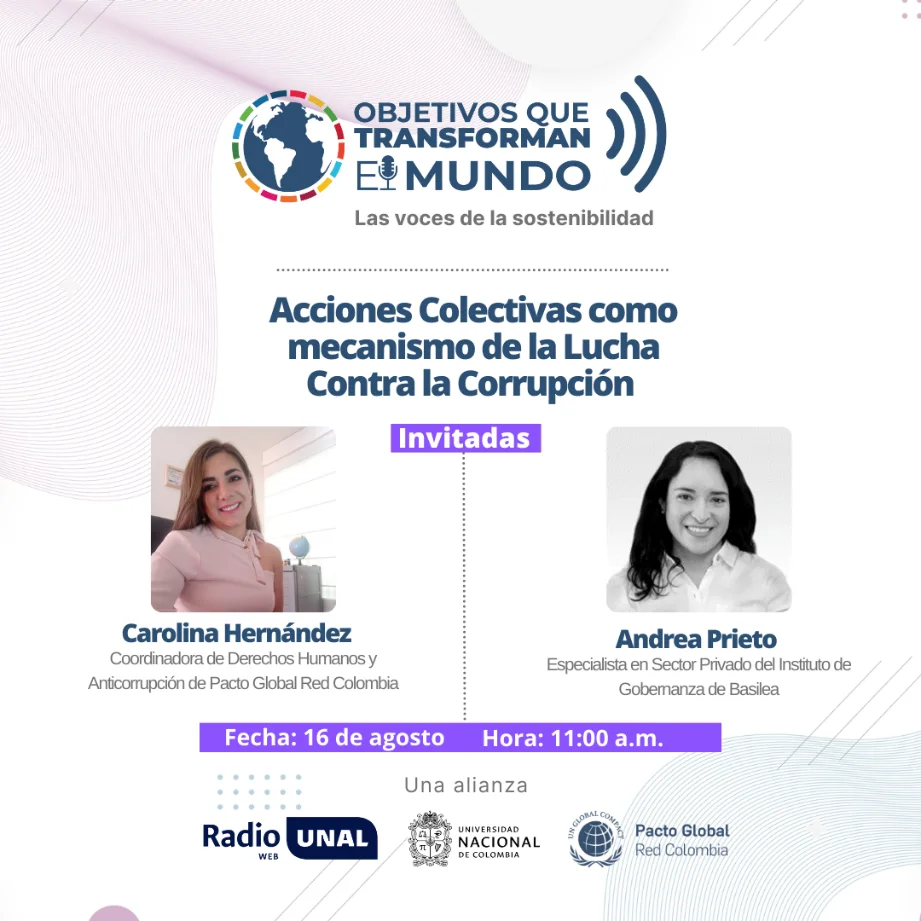 En la próxima emisión de Objetivos que Transforman el Mundo, el programa de radio digital de Pacto Global Red Colombia junto a la Universidad Nacional de Colombia, estaremos dialogando con Carolina Hernández, Coordinadora de Derechos Humanos y Anticorrupción de Pacto Global Colombia; y Andrea Prieto, Especialista en Sector Privado del Instituto de Gobernanza de Basilea, para conocer junto a ellas cómo la las acciones colectivas se constituyen en un mecanismo que pueden utilizar las empresas para apoyarse en materia de lucha contra la corrupción. Escúchenos este miércoles 16 de agosto en la emisora Radio Web UNAL – Opción Radio Web - en vivo a partir de las 11:00 a.m.