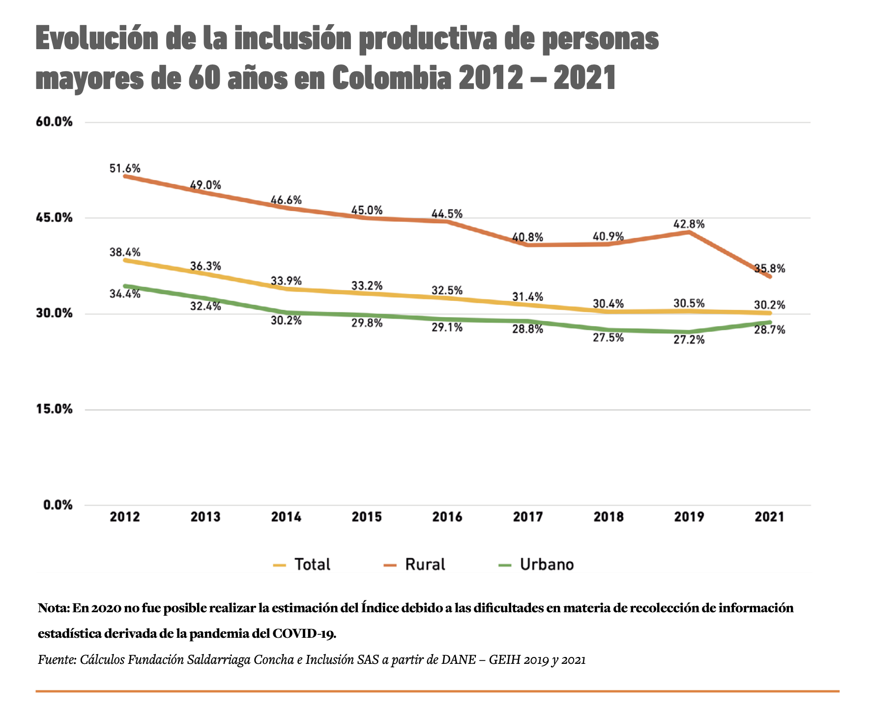 Nota: En 2020 no fue posible realizar la estimación del Índice debido a las dificultades en materia de recolección de información estadística derivada de la pandemia del COVID-19. Fuente: Cálculos Fundación Saldarriaga Concha e Inclusión SAS a partir de DANE – GEIH 2019 y 2021.