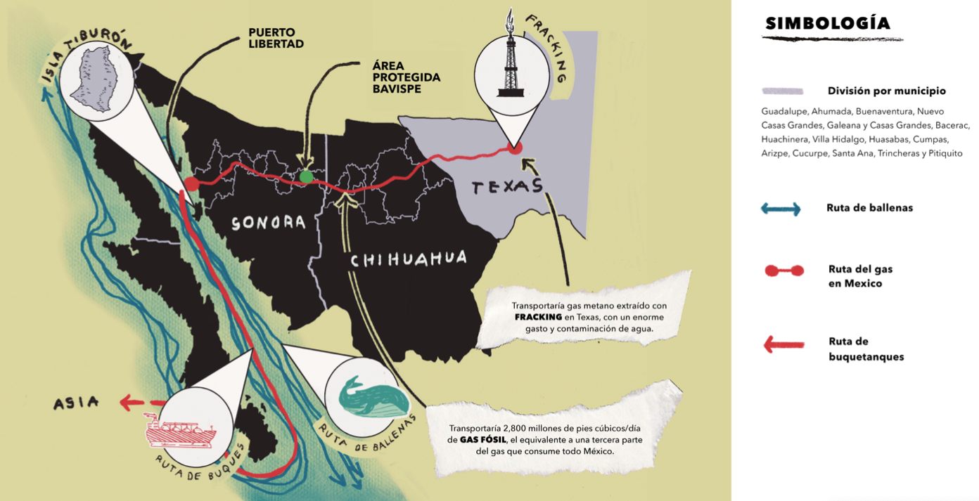 El proyecto contempla la construcción del gasoducto “Sierra Madre” que, con sus 800 kilómetros, atravesaría el noroeste de México —partiendo desde Texas, en Estados Unidos, y pasando por los estados de Chihuahua y Sonora, en México— hasta el Golfo de California, donde se instalaría una terminal de licuefacción de 400 hectáreas, llamada “Saguaro Energía”, en la comunidad de Puerto Libertad, Sonora.