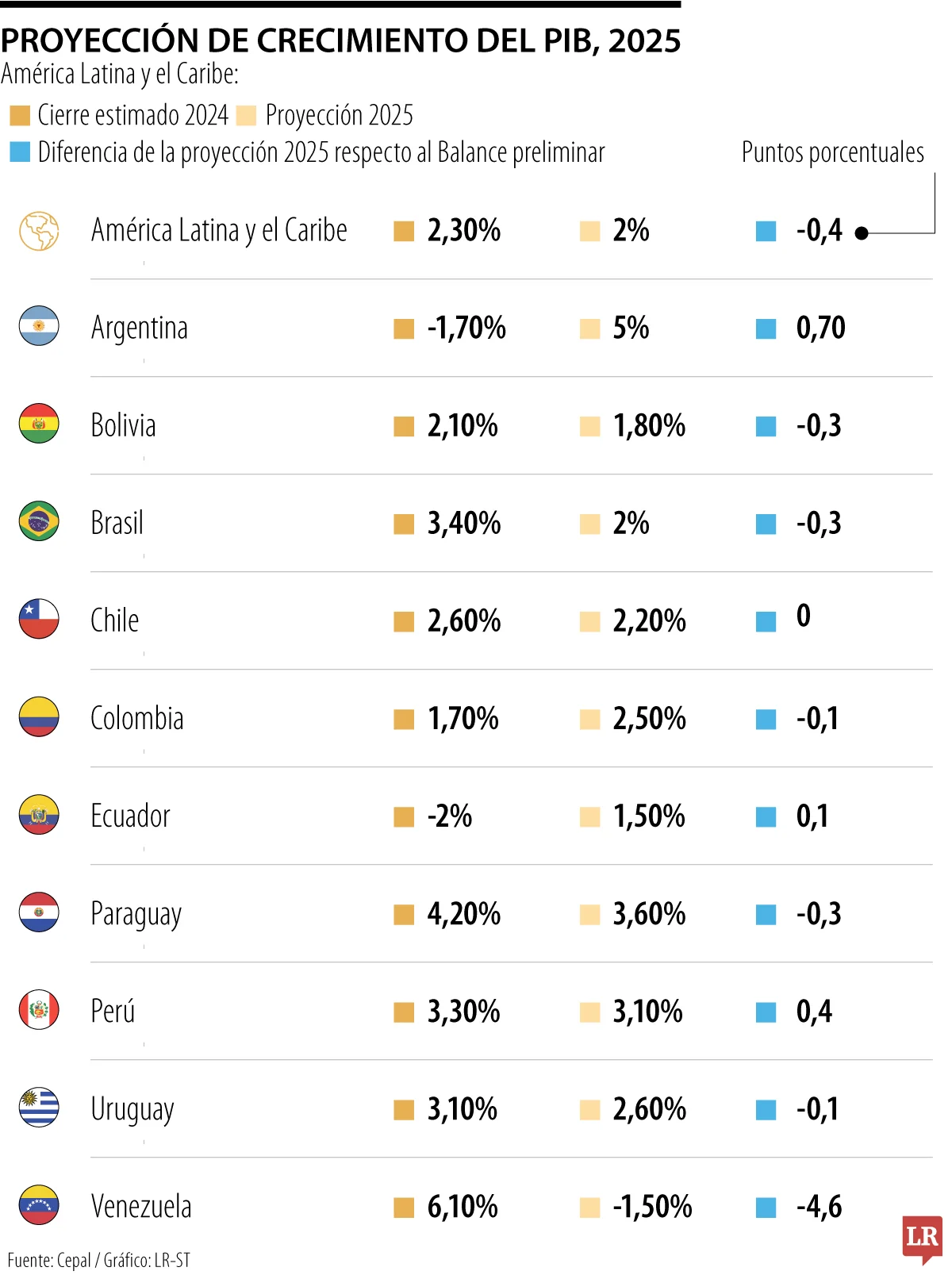 Según la Cepal, la región está enfrentando un escenario internacional muy complejo y de mucha incertidumbre. Los anuncios en materia de aranceles efectuados por parte de Estados Unidos no solo tienen efectos directos sobre las exportaciones de los países de la región a dicha economía, sino también efectos indirectos por la vía de una mayor volatilidad en los mercados financieros internacionales, con importantes fluctuaciones en los mercados de valores y bonos, lo que tiene claras implicaciones en el rendimiento de los activos y de la tasa de interés en Estados Unidos y en los principales mercados financieros mundiales.