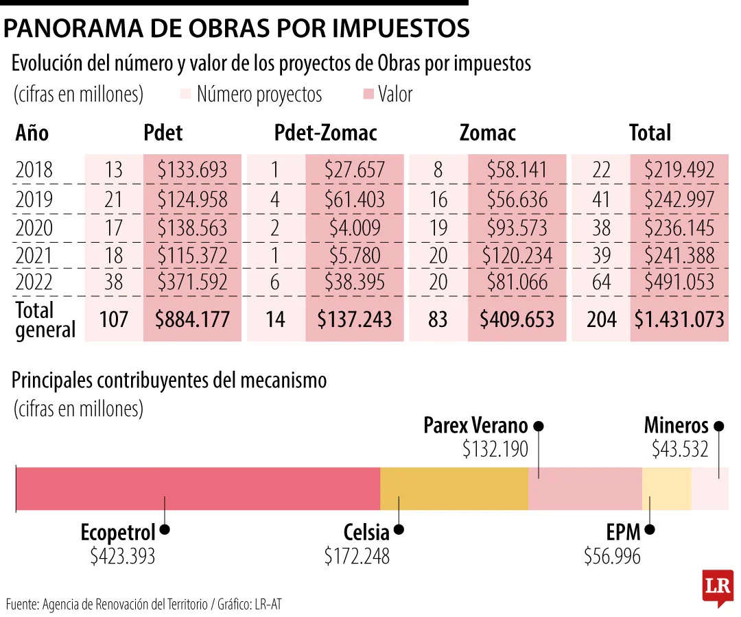 De acuerdo con la Agencia de Renovación del Territorio, ART, entre 2018 y 2022 cerca de 120 empresas financiaron 204 proyectos por $1,4 billones; con una participación destacada de Ecopetrol, Celsia, Parex, EPM y Mineros.