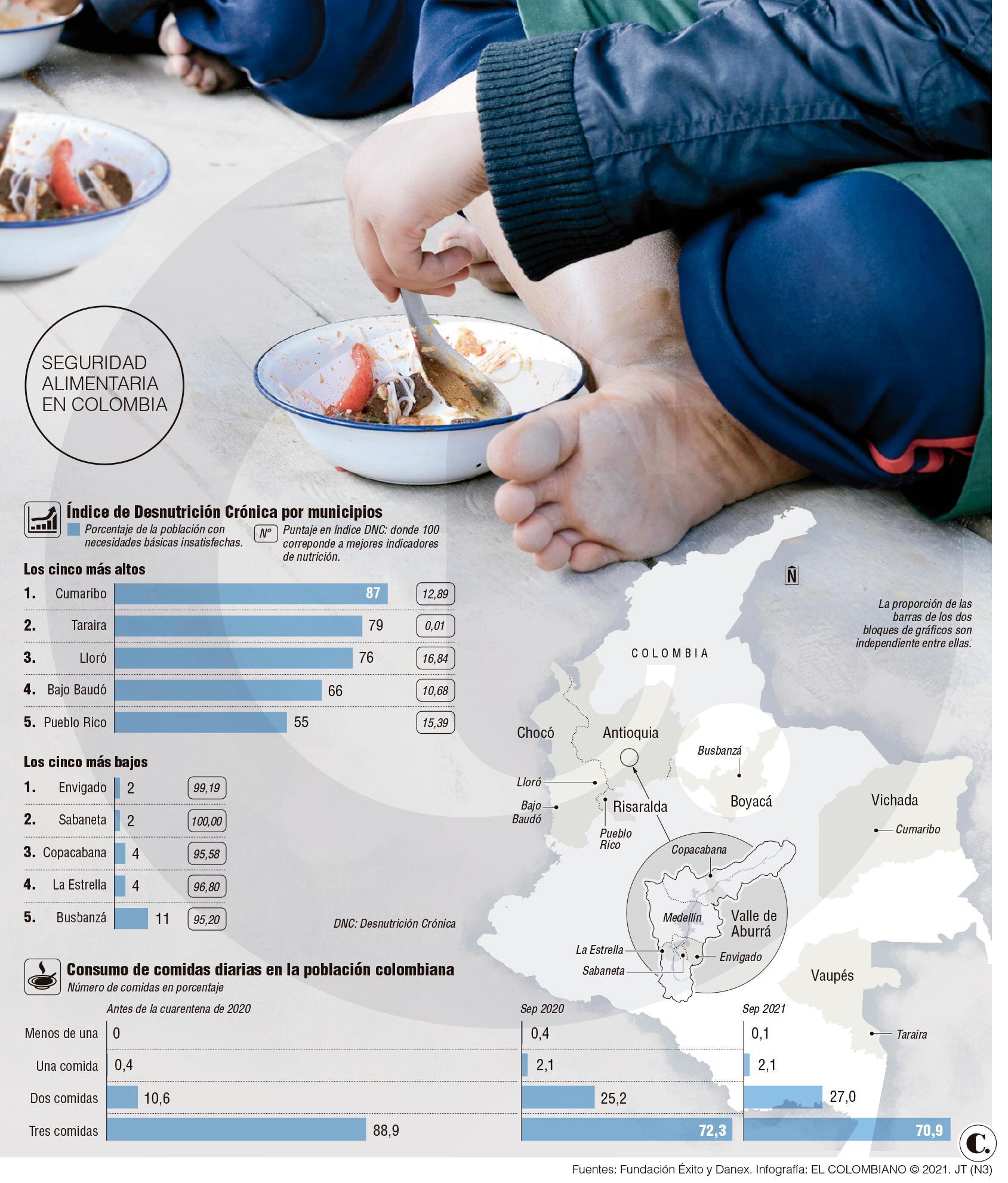 De acuerdo con el Dane, el porcentaje de personas que comía tres veces al día pasó de 72,3 % en septiembre de 2020 a 70,9 % en el mismo mes de 2021. A su vez, el número de quienes consumían solo dos comidas al día en septiembre de 2021 subió 1,8 % con relación al mismo período de 2020 (ver infografía).