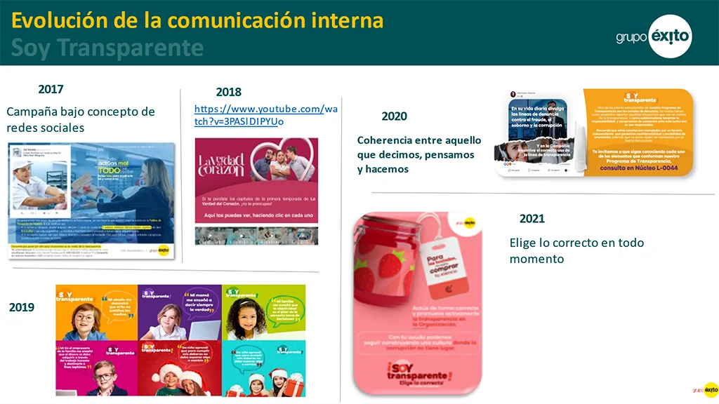 Por su parte, Paulina Acosta, representante del Grupo Éxito, compartió cómo a lo largo de 10 años, la organización ha venido innovando con diferentes estratégicas de formación, profundización y comunicación en el marco de su estrategia “Soy Transparente”, la cual nace con el propósito de generar conciencia frente a la dinámica de la compañía y la responsabilidad que se tiene frente a la sociedad y la prevención y gestión de los riesgos de soborno y corrupción, apoyados en buenas prácticas para la generación de relaciones de valor con los grupos de interés, en las que la objetividad, la ética y la transparencia son protagonistas. En ese sentido, el concepto “Soy Transparente”, cobra relevancia de Gestión de Riesgos en la gestión de programas anticorrupción.