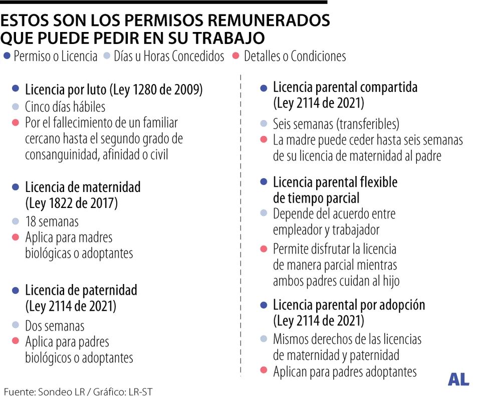 Los padres trabajadores tienen derecho a dos días hábiles remunerados para acompañar el nacimiento de un hijo. Este beneficio, regulado en el artículo 236 del Código Sustantivo del Trabajo, fortalece la participación activa del padre en el entorno familiar.En el código también establece que las mujeres embarazadas tienen derecho a una licencia de 18 semanas (equivalente a cuatro meses), durante las cuales recibirán el salario correspondiente al momento de iniciar este periodo.