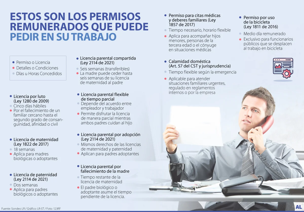“Los permisos remunerados son aquellos en los que los trabajadores pueden ausentarse de sus labores, siempre y cuando exista una causa justa para dicha ausencia. Algunas licencias remuneradas en Colombia son la ausencia por enfermedad, calamidades domésticas, matrimonio, mudanzas, funciones sindicales o exámenes prenatales. El trabajador deberá solicitar el permiso por escrito a su empleador, quien determinará si lo concede o no”, dijo Walter Castro Peñuela, abogado de Lexpertise.