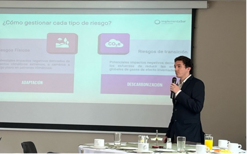 El pasado 1 y 2 de abril lideramos junto a IMPLEMENTASUR, en Bogotá y Medellín respectivamente, un taller para guiar al sector empresarial en la construcción de estrategias climáticas. Estos espacios surgen como respuesta a la necesidad de las organizaciones para fortalecer sus capacidades en la gestión del cambio climático, promoviendo la integración de riesgos climáticos en la toma de decisiones, ya que los potenciales impactos negativos generados por fenómenos climáticos y las respuestas ante el cambio climático, pueden provocar impactos directos o indirectos sobre los negocios.
