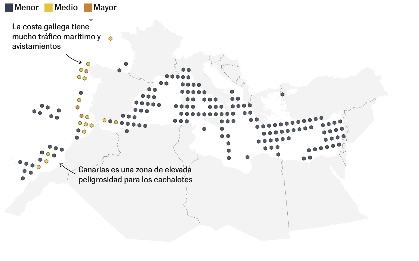 Como sucede con las carreteras, en el mar también hay puntos negros. Los autores centraron una segunda fase del estudio en el 1% de las zonas donde más se solapan los datos AIS de los barcos con los avistamientos de cetáceos. Un primer dato recuerda quién llegó antes: en el océano Antártico, por donde apenas se atreven a pasar los cargueros, no hay ningún punto caliente (o hotspot en la jerga inglesa). En el otro mar para valientes, el océano Ártico, solo hay un 0,56% del total de los puntos calientes. El tráfico marítimo internacional a gran escala se inició en el siglo XIX, pero se ha acelerado en las últimas décadas, cuadruplicándose desde 1992. Además, se concentra en unas pocas zonas: son el Índico (21,6%), el Pacífico norte (14,5%) y el Mediterráneo (13,3%) donde se eleva el riesgo. Y no es en alta mar, casi todos los puntos negros están cerca de la costa. Las que bañan el este de China, sur de Asia y oeste de Estados Unidos son de las más peligrosas. En Europa, las aguas frente a Galicia, las del estrecho de Gibraltar y el sur del Mediterráneo están entre las de mayor peligro para tres de las especies. Canarias aparece muy destacada en el mapa de elevada peligrosidad para la cuarta, el cachalote.