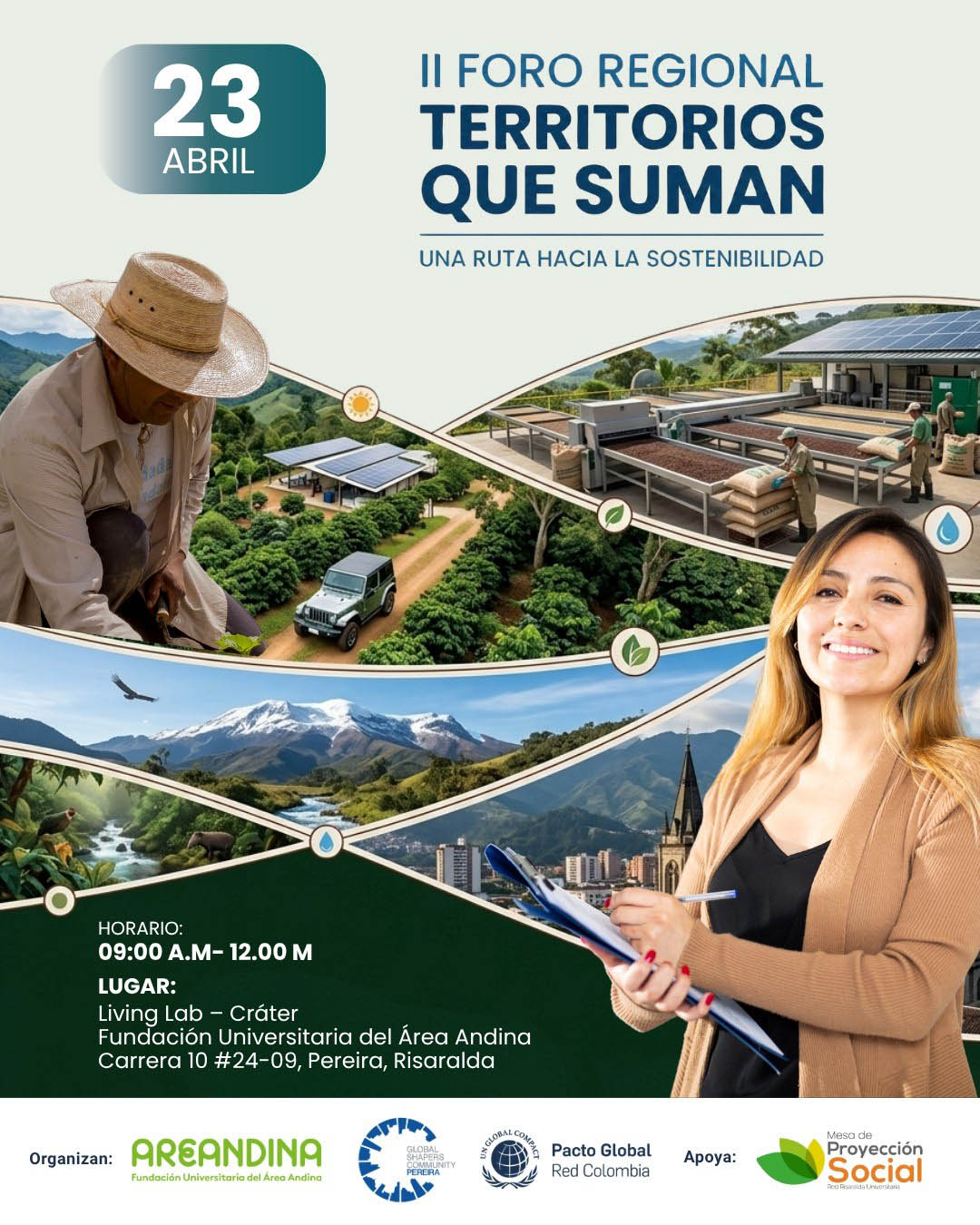 La Fundación Universitaria del Área Andina, Global Shaper Comunnity y Pacto Global Red Colombia, con el apoyo de la Mesa de Proyección Social Red Risaralda Universitaria, los invitamos a acompañarnos en el II FORO REGIONAL TERRITORIOS QUE SUMAN: UNA RUTA HACIA LA SOSTENIBILIDAD, el próximo 23 de abril, de 9:00 a.m. a 12:00 del día en el Living Lab -Cráter Fundación Universitaria del Área Andina Carrera 10 # 24-09 Pereira, Risaralda.