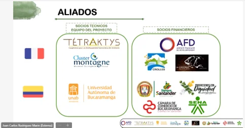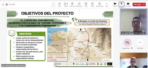 Cerrando la sesión, intervino Juan Carlos Rodríguez, Director de Investigación de la Facultad de Economía y Negocios de la Universidad Autónoma de Bucaramanga – UNAB. El Profesor Juan Carlos presentó los principales detalles del proyecto Entre los Alpes y los Andes, un ejemplo de Cooperación Internacional en la que se posiciona la región conocida como el Cañón del Chicamocha, como un modelo replicable de turismo sostenible y de gobernanza compartida, en liderazgo con otros socios técnicos como las organizaciones francesas de TETRAKTYS y Cluster montagne.
