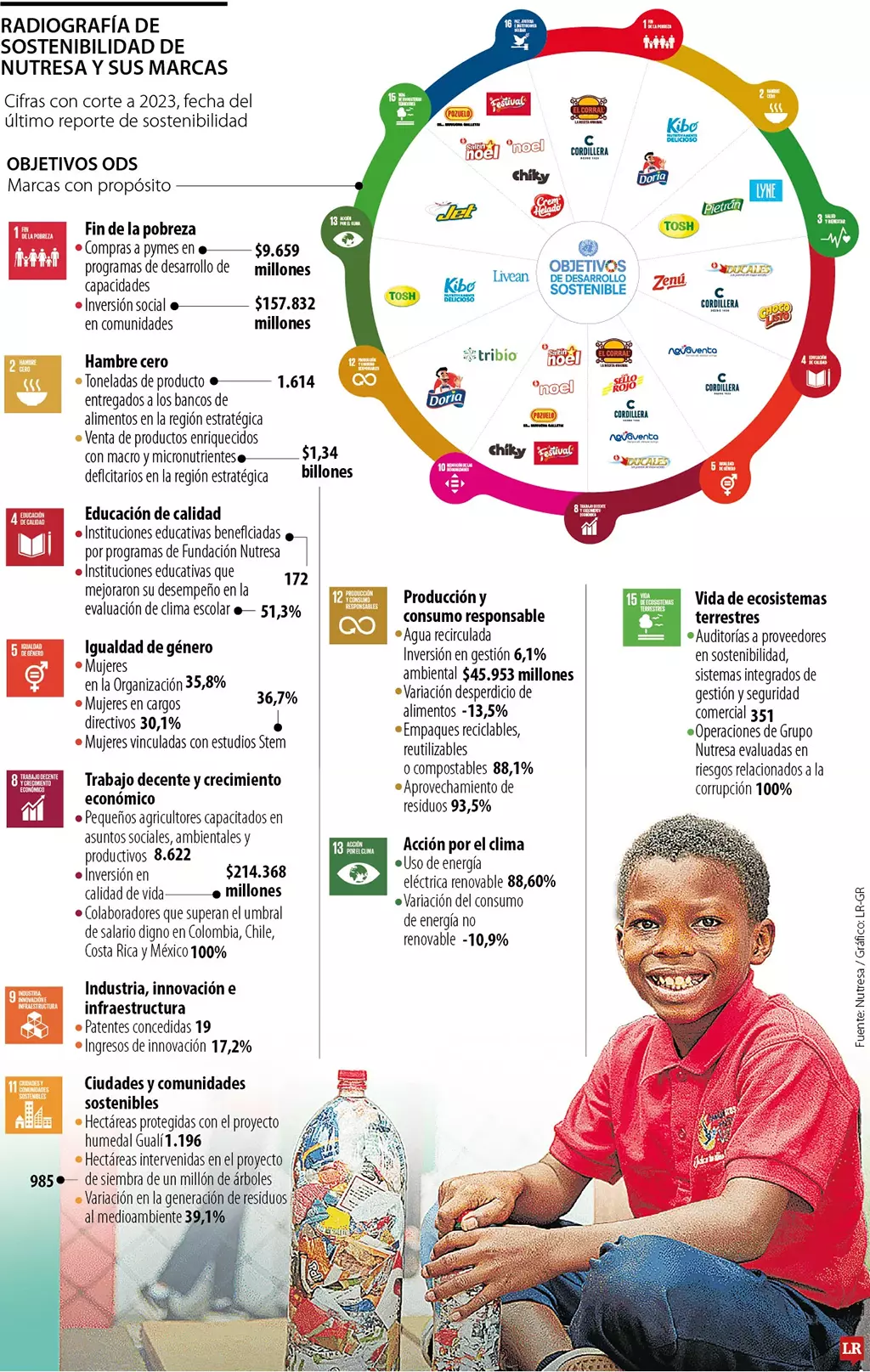 En el caso de la multilatina, de alimentos la parte sostenible es, según su más reciente reporte de sostenibilidad (2023), una capacidad corporativa esencial. Por ello, se centran en unos objetivos de desarrollo sostenible, ODS, encaminados a distintas aristas, como ejemplo: han realizado inversiones sociales de $157.832 millones en comunidades; destinaron 1.614 toneladas de producto entregadas a los bancos de alimentos y han beneficiado 172 instituciones educativas por programas de la Fundación Nutresa.