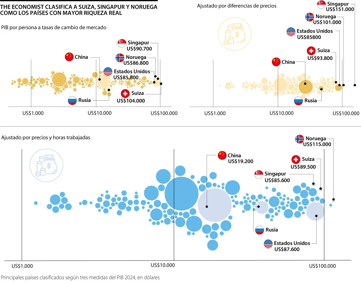 The Economist midió la riqueza real en 178 países teniendo en cuenta las naciones donde se generan ingresos trabajando menos horas