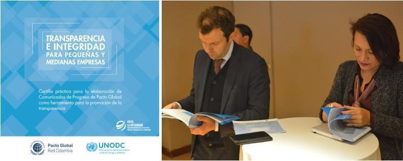 Bogotá D.C., 27 de febrero de 2018. En el marco de las actividades desarrolladas con Pequeñas y Medianas empresas (PyMes) durante la implementación de la iniciativa "Hacia la Integridad: una construcción entre los sectores público y privado contra la corrupción en Colombia", la Oficina de las Naciones Unidas contra la Droga y el Delito (UNODC) y Pacto Global Red Colombia, presentaron la cartilla práctica Transparencia e Integridad para Pequeñas y Medianas Empresas , orientada en la elaboración de Comunicados de Progreso de Pacto Global como herramienta para la promoción de la transparencia.